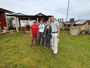 We also teamed up with Hands for Peacemaking staff and village leaders as we walked up and down mud-slicked trails and roads to get our work done, with the children of the village following us everywhere. Today’s weather totally cooperated though – no rain with moderate temperatures in the 70s.  After installing 44 stoves today we are all tired but well. Only 85 more to go.