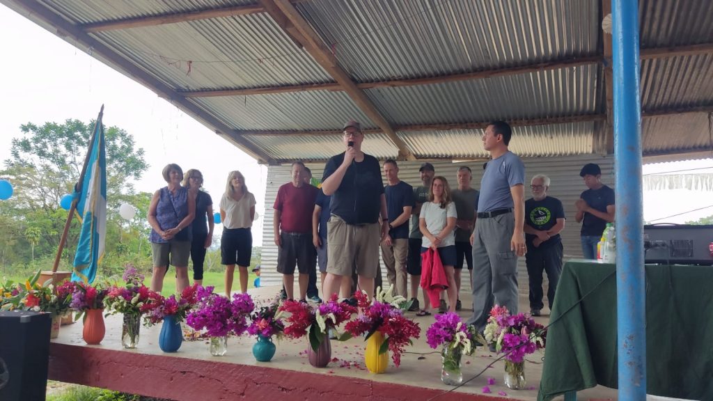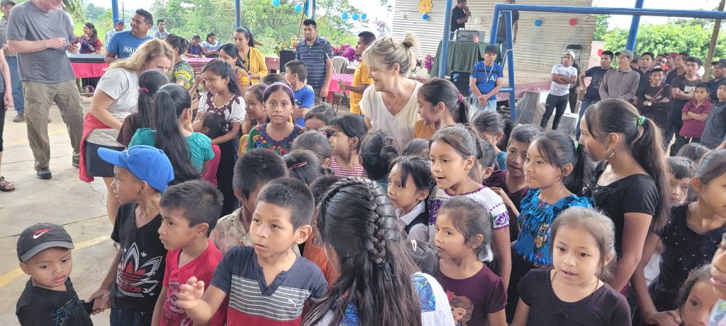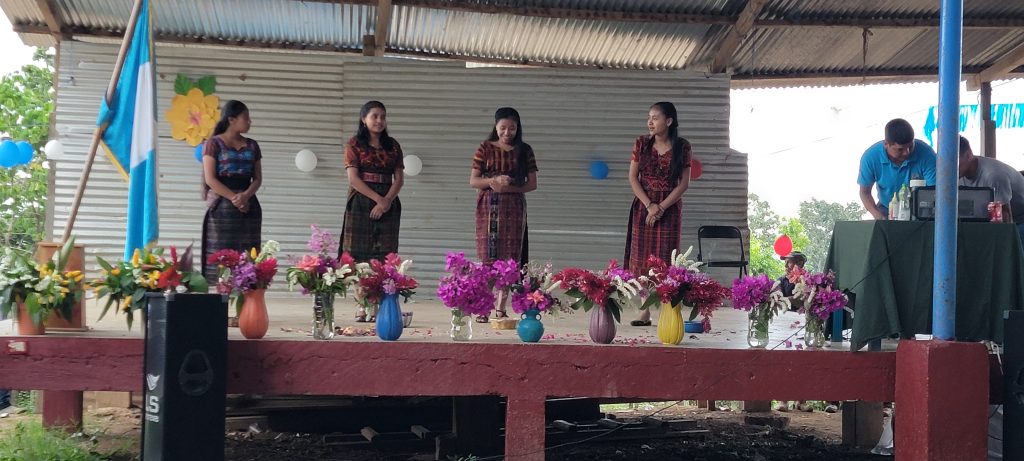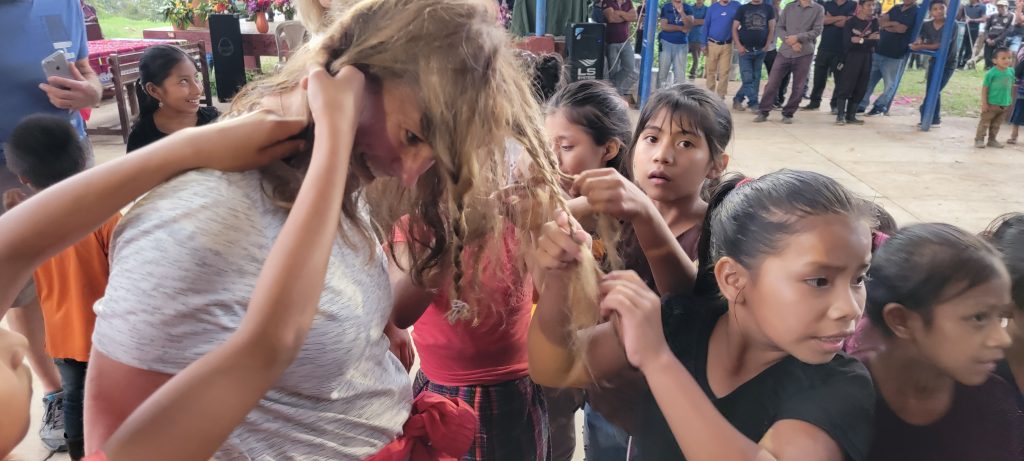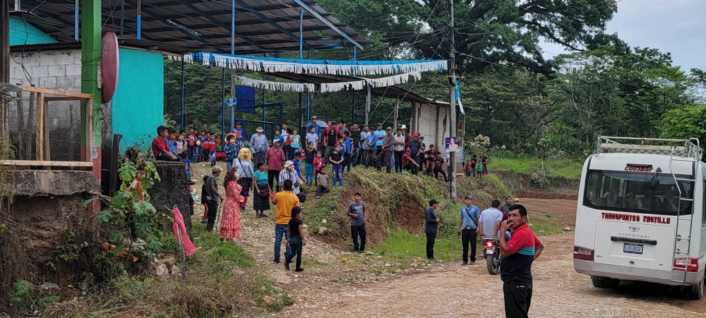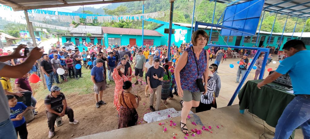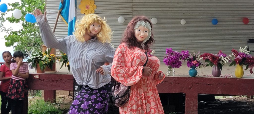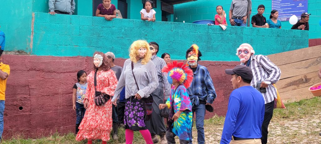 We had one of the more unusual greetings I’ve encountered in my eight trips to Guatemalan villages – a merry band of clowns and cross-dressers urged us to follow them up the hill to the large stage by the village courtyard, where we were soundly welcomed by village officials and the villagers and given a chance to make our own speeches and introduce ourselves before the large gathering of villagers.
