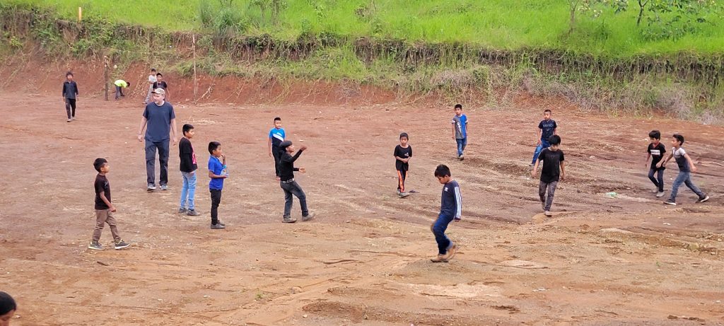 All that was followed by a series of hugs from many of the villagers and lots of interplay with the children. Marco, Zach and Erich joined a couple dozen of the boys out on the soccer pitch using some of the new soccer balls we brought while the rest of us stayed in the courtyard, where the kids played basketball with the two roundballs Tom purchased for them.