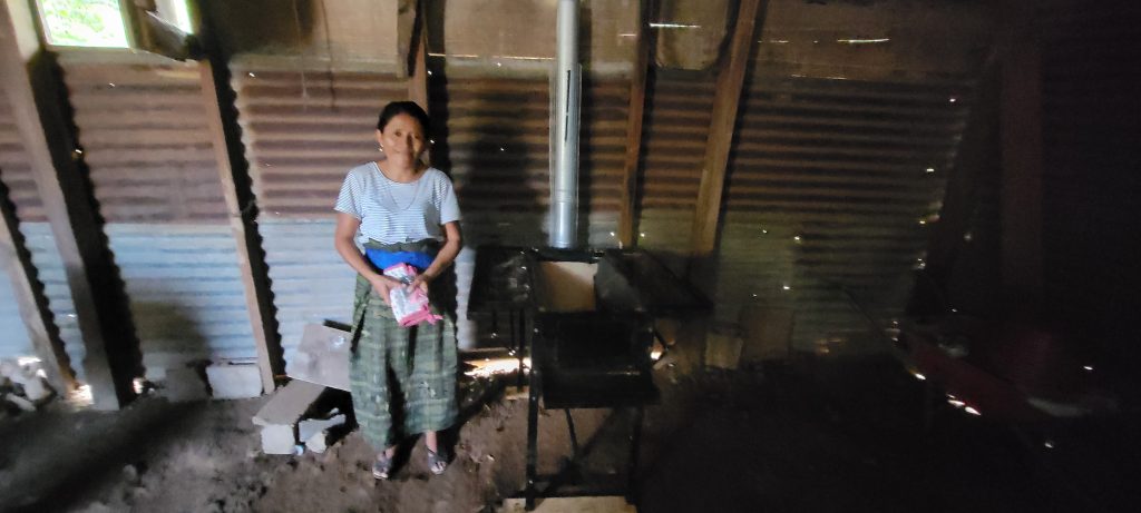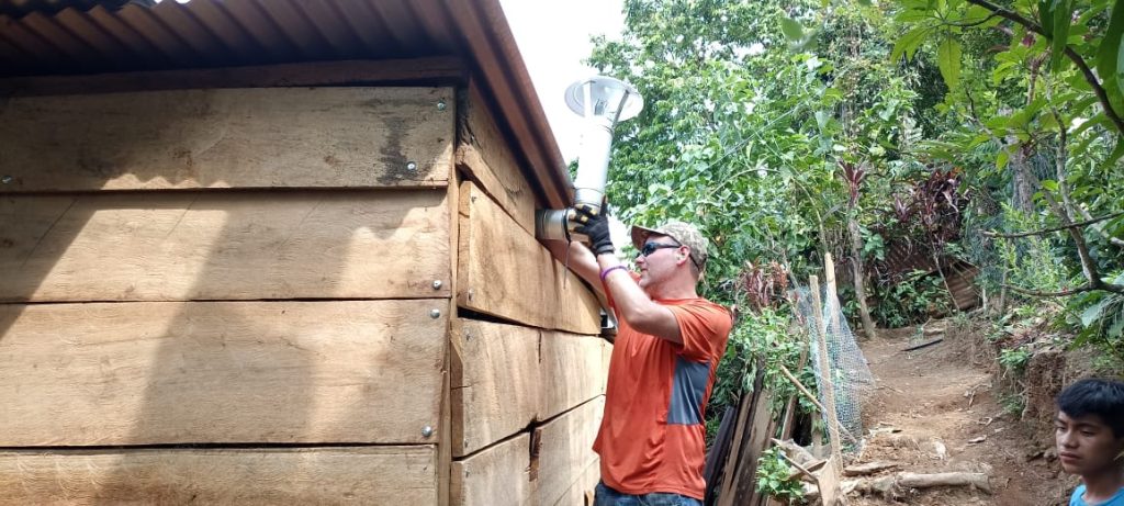 Here’s the stove assembly process in a nutshell: Arrive at the home and look for the packed up stove and accessories, not always apparent in the dimly lit house. Once found, first unpack the stove box, then bolt in the back legs and tray supports and bottom pieces, flip over and attach the front legs and “ashtray,” bolt on the side trays (there are 38 bolts in all) and underlying heat protection strips, then bang in the damper, put in the “metal bricks,” place the bottom clay bricks, tilt stove, pour sand in each side, place the end bricks and the stove is done. Every team did things a little differently, but most had other members fitting the outside stove pipe along the interior wall then outside to the roof while the others were completing the stove. If all went right the two processes would be completed about the same time. Oh, and if the floor was dirt, as most were, it was often lumpy and had to be leveled with hoe or other available implement before the stove could be placed on the two boards that came with the stove kit. Sometimes the stove went together well, but the stove pipes were a challenge, especially if the home was two stories or more.